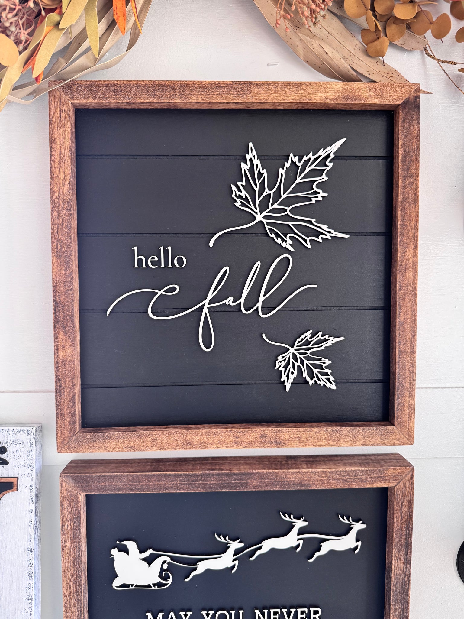 Celebrate the seasons in style with this reversible farmhouse sign. Crafted with a rustic wood frame and classic black backdrop, it transitions beautifully from fall to winter. One side welcomes autumn with a graceful “hello fall” design accented by delicate leaves, while the reverse captures holiday magic with a festive quote and Santa’s sleigh silhouette. A timeless, versatile piece — perfect for mantels, shelves, or entryways — that carries your home from cozy fall days to the wonder of Christmas Eve.